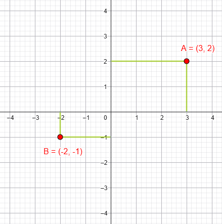 En la figura se observan los puntos A(3, 2) y C(−2, −1):