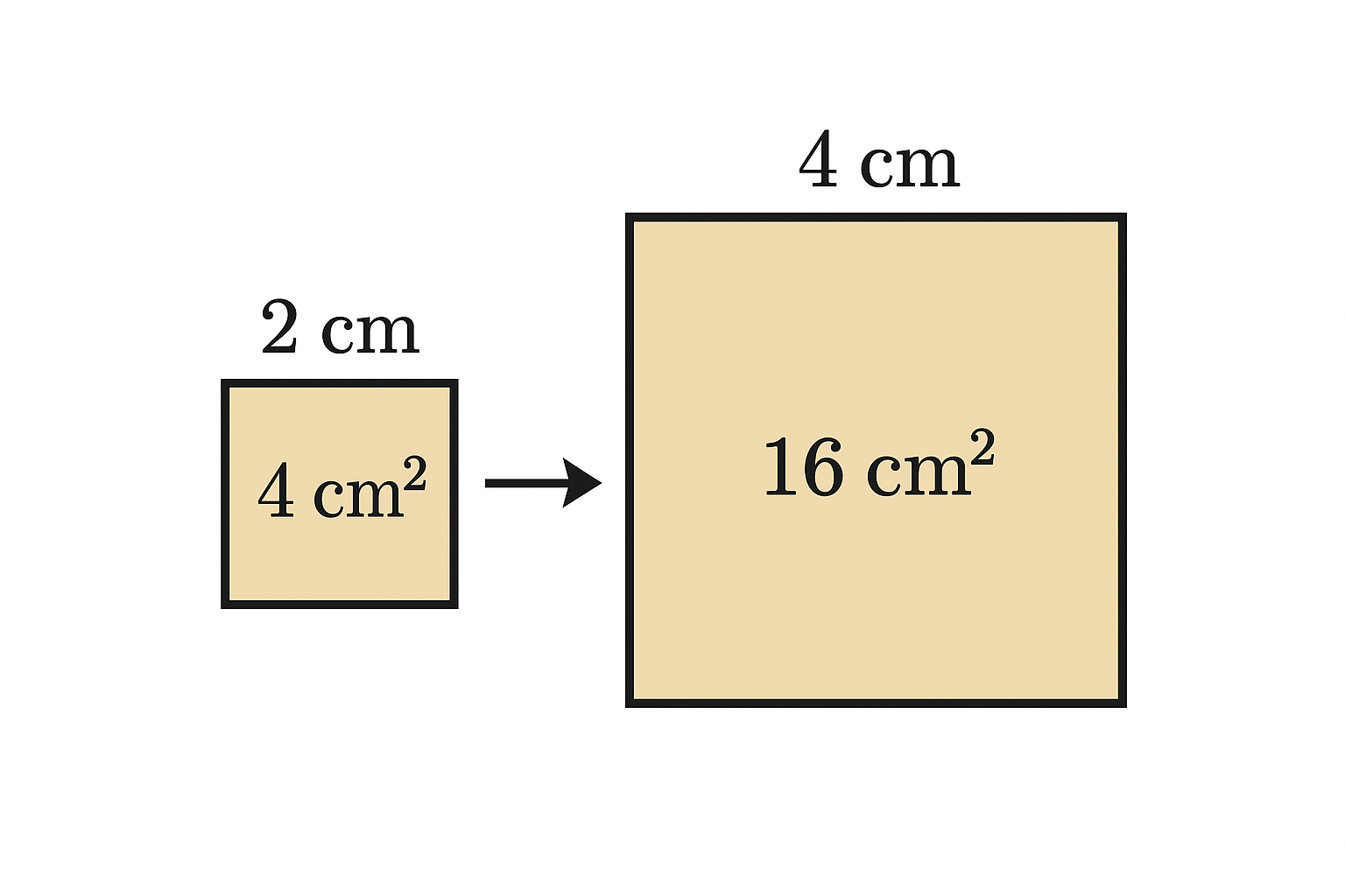 Por ejemplo, un cuadrado de 2 cm de lado tiene 4 cm² de área. Si duplicas el lado a 4 cm, su nueva área será 16 cm².
