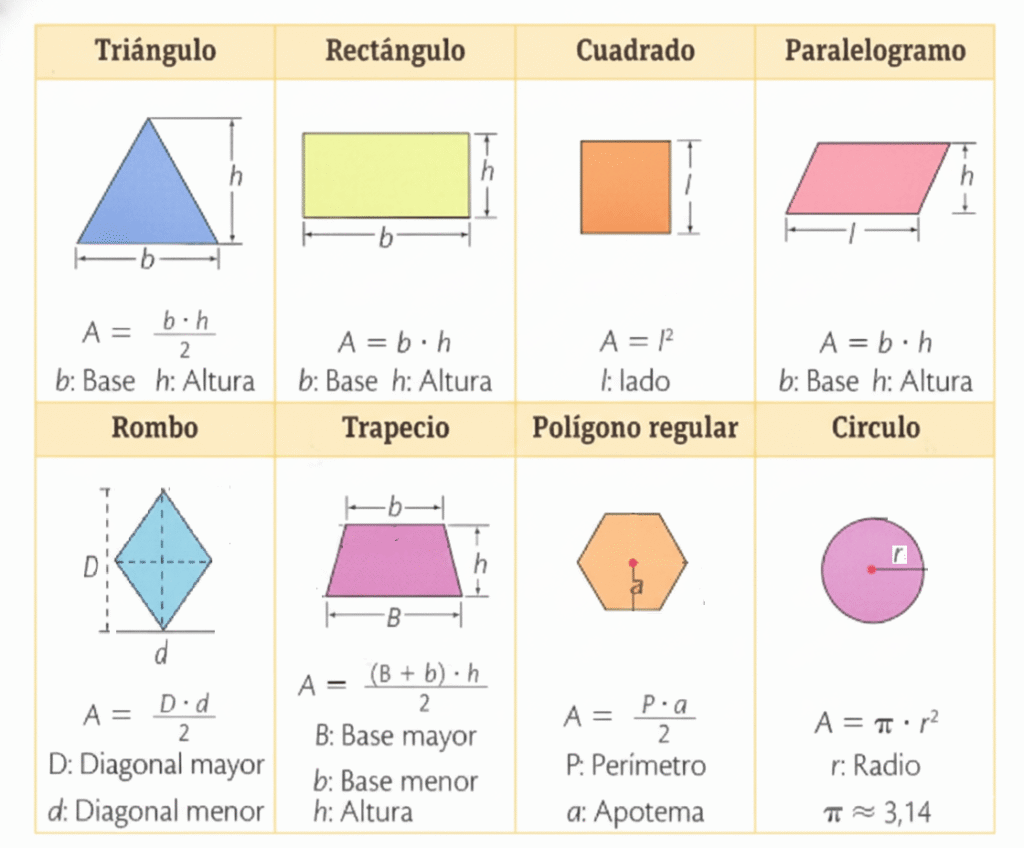 El área de una figura plana depende de su forma. Algunas fórmulas básicas son: