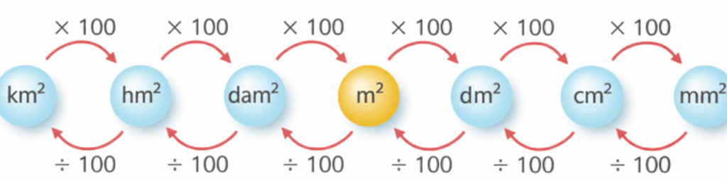 Al ser una magnitud de dos dimensiones, cada cambio de unidad implica multiplicar o dividir por 100 (no por 10, como ocurre con la longitud).